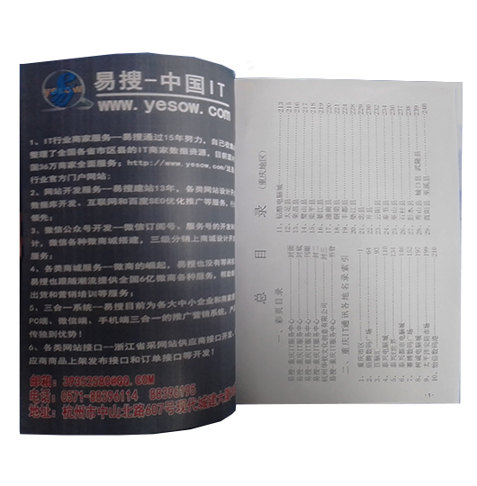 易搜《重庆IT行业通讯》终于又与大家见面了,这次重庆的通讯录出刊,历经了很多我们全体员工的努力,从第一线收集名片、资料到最后的核对、排版及出刊,经过长时间的奋斗,相信大家也期待已久了,这次的重庆IT通讯录信息量更全面、更新颖,内容更丰富,不仅带给我们员工不一样的经历和感受,更会带给我们的商家不一样的回报,与往常更不一样哦。